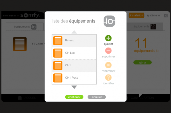 Vous pouvez ajouter des équipements IO Homecontrol (si toutefois vous avez souscrit à l’option pour 169€), des équipements RTS, ainsi que des capteurs et des contrôleurs.