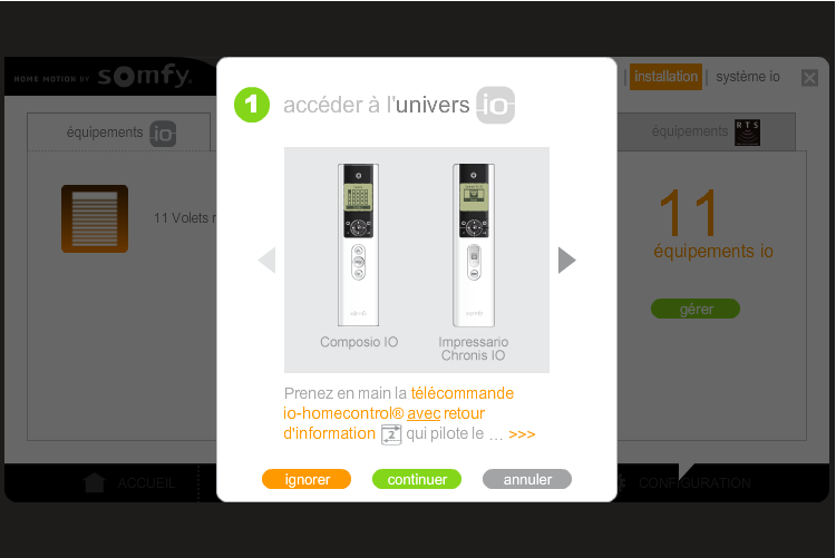 La procédure pour ajouter les équipements IO Homecontrol est simple mais nécessite une télécommande IO Impressario Chronis. Vous pouvez également le faire via vos télécommandes situo mais vous devez ajouter la clé de chiffrement pour chaque équipement … donc cela prend un peu plus de temps. L’avantage avec la télécommande Impressario : tous vos équipements sont enregistrés en une fois.